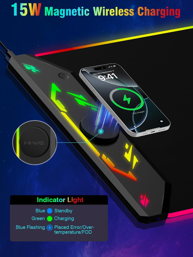 HIWE RGB Gaming Mouse Pad 15W Magnetic Wireless Charging 35X15.8 Extra Large Desk Mat 24 Light Effects Non-Slip Base Waterproof for Gamers