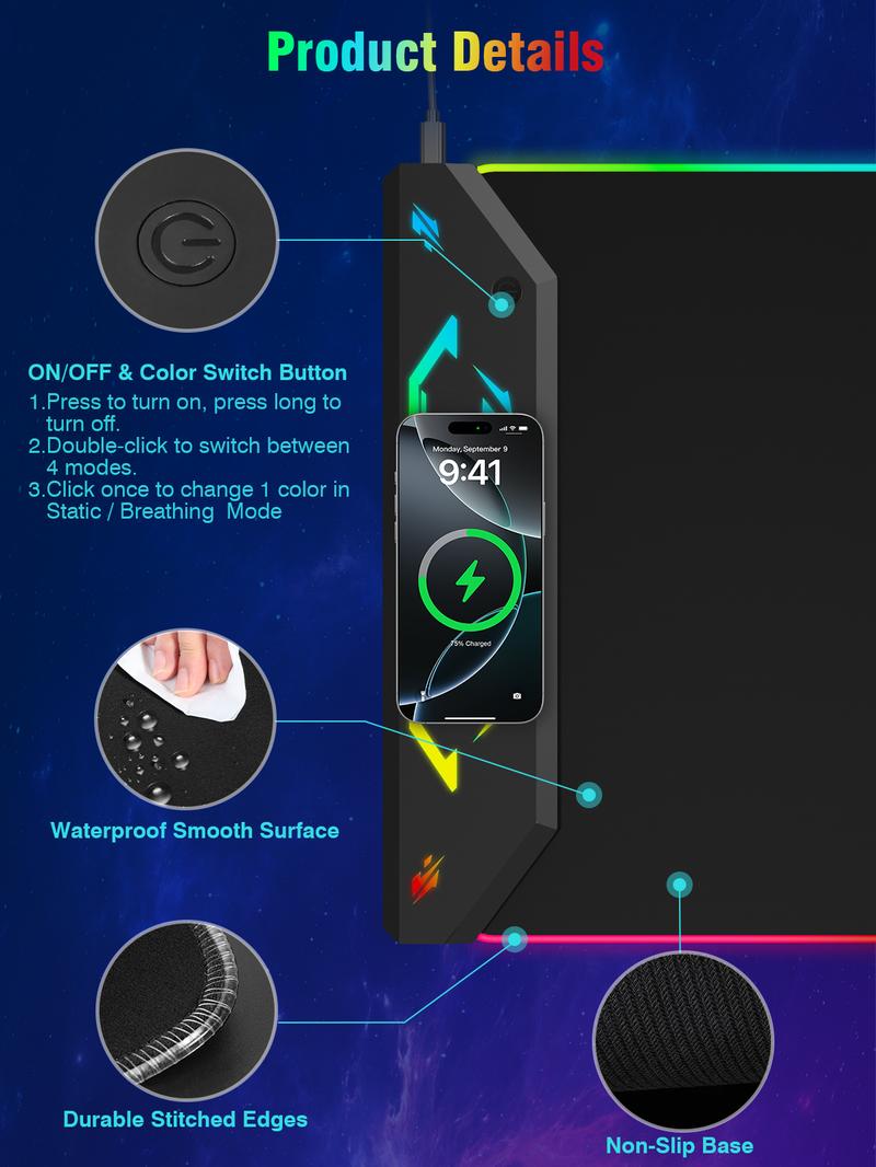 - Smart Safety & Anti-Slip Design:Built-in Smarship tech prevents overcharging, overheating, and short circuitsNatural rubber base with textured grip keeps the mat firmly in place during intense gameplay