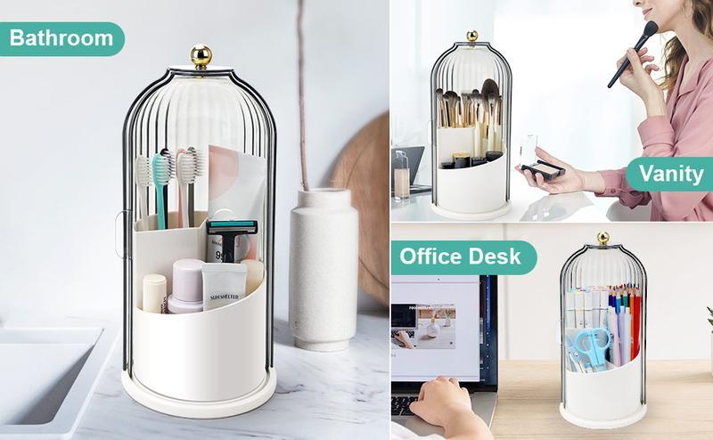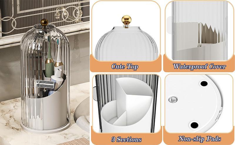 Makeup Brushholder Organizer with Cover 360 Rotating Clear Dustproof Waterproof 3 Slots Bathroom Countertop Organizer for Vanity Makeup & Toothbrush Holder Grey White Cartoon Pattern